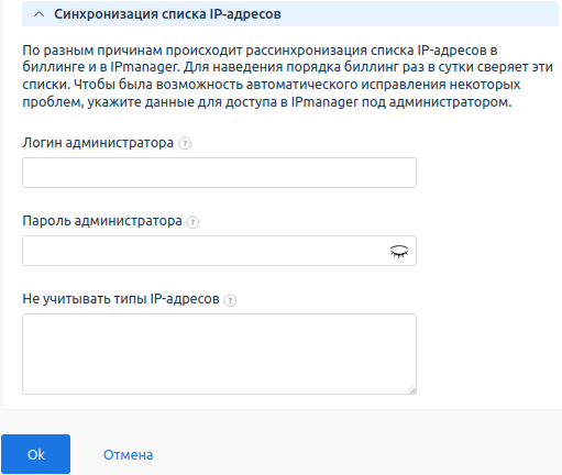 Для синхронизации IP-адресов не рекомендуется указывать данные администратора IPmanager. Особенно, если в IPmanager существуют IP-адреса, занятые вручную (не BILLmanager'ом) и в биллинговой платформе эти адреса не привязаны к услугам.
