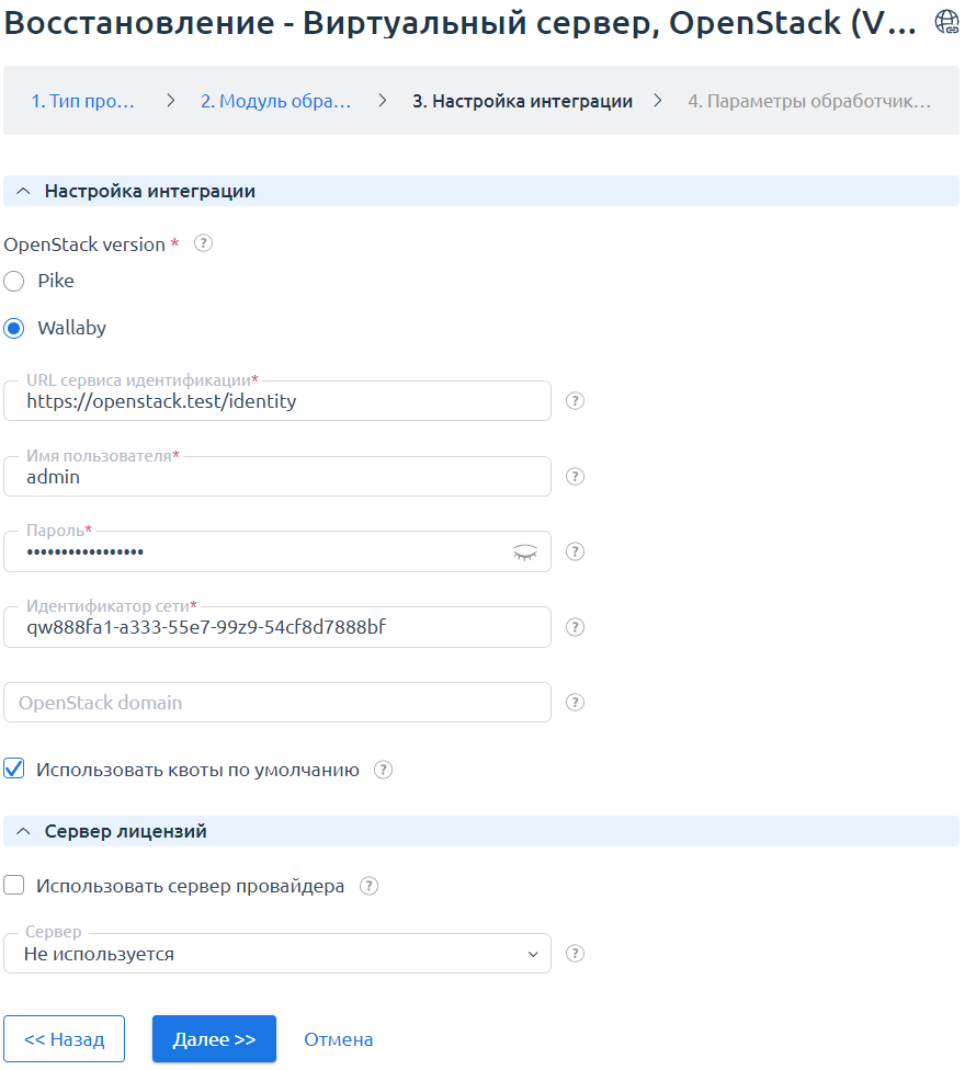 - OpenStack version — версия OpenStack, для которой будет настроен модуль обработки. Работа модуля гарантируется только с версиями Pike и Wallaby;