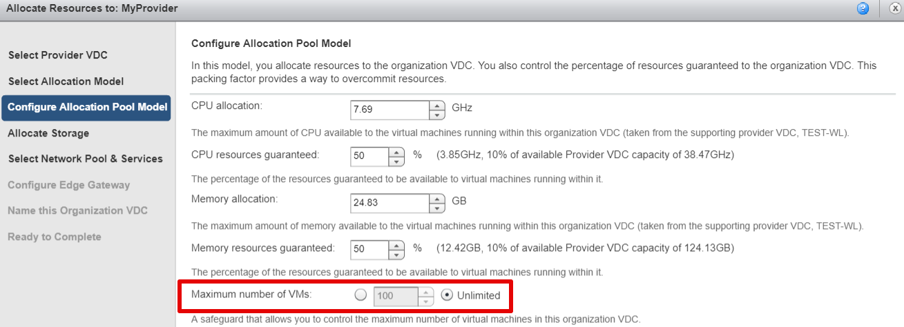 - Этап "Configure Allocation Pool Model". Maximum number of VM's — выберите Unlimited.
