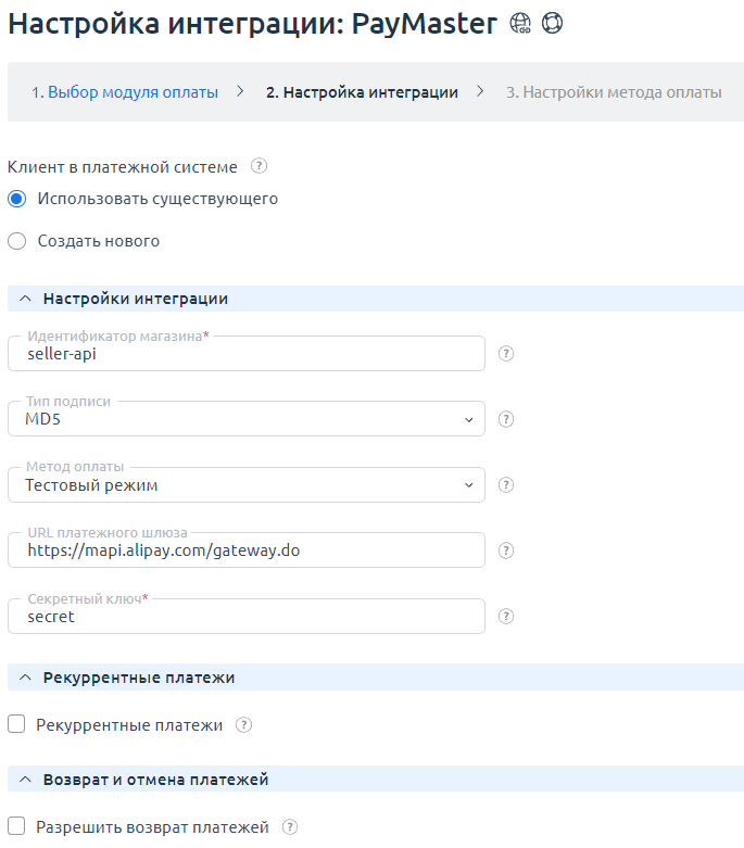 - Секретный ключ — секретный ключ на стороне PayMaster