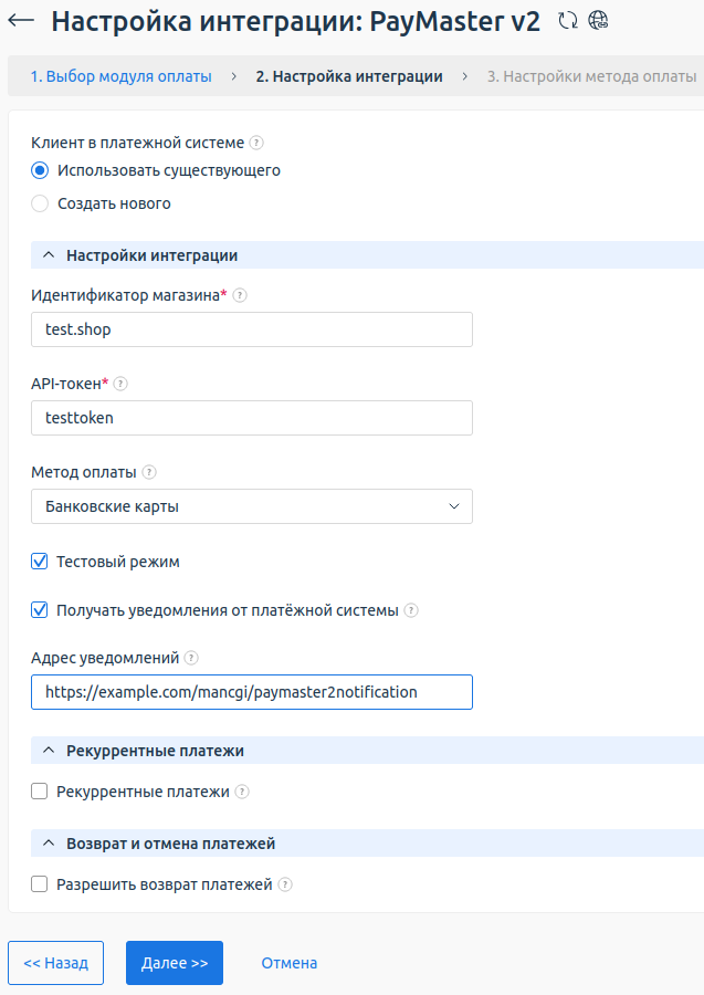 Для использования модуля оплаты PayMaster выполните настройку на стороне платёжной системы и подключите модуль в BILLmanager.