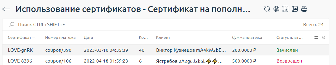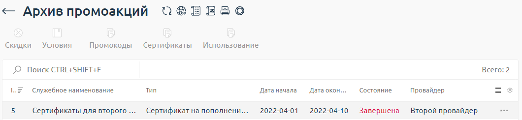 Использование — общий список активаций промокодов и сертификатов, которые участвуют в промоакции;