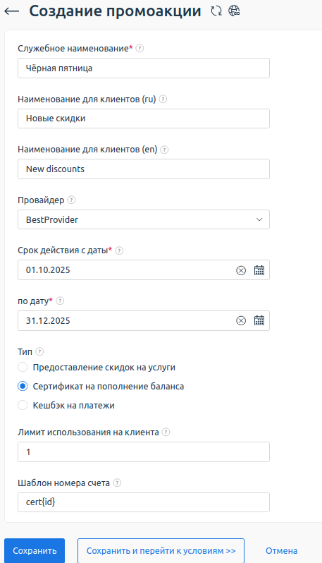 - Создание промоакции — основные настройки, которые определяют провайдера, который проводит промоакцию, и срок действия промоакции.
