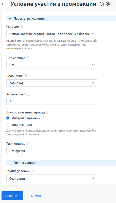 - Выберите Условие — "Использование сертификатов на пополнение баланса".