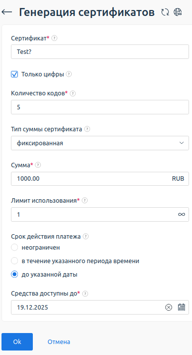- Лимит использования — укажите, сколько раз клиент может использовать сертификат.