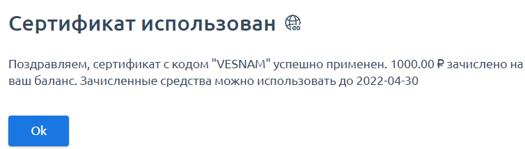 - сертификат успешно активирован — клиенту будет выведено сообщение с информацией о пополнении лицевого счета на сумму сертификата и с указанием даты, до которой можно использовать платёж;