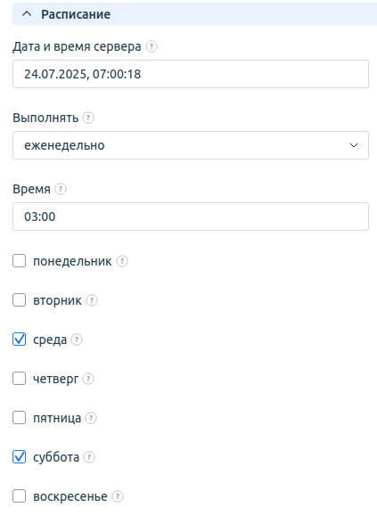 Система может запускать задание резервного копирования ежедневно в указанное время, или еженедельно в выбранные дни:
