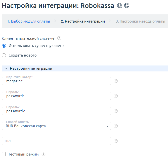 Заполните форму, используя данные существующего клиента в платёжной системе:- Идентификатор — уникальный идентификатор магазина в системе Robokassa.