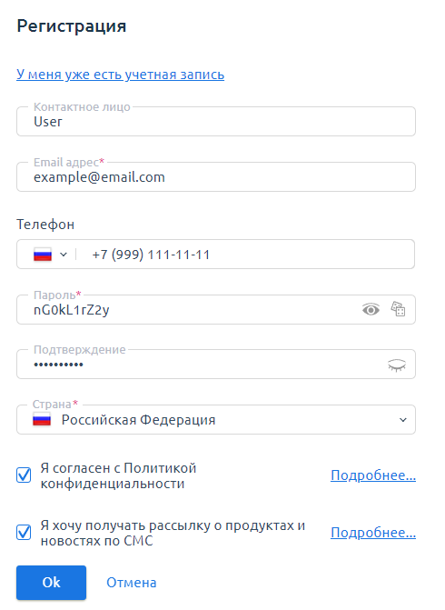 - Новостные уведомления (маркетинг) — согласие клиента с условием такого типа активирует подписку на новостные (маркетинговые) уведомления по email;