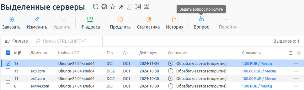- Заказать — создать выделенный сервер. Подробнее см. раздел Заказ ВС;