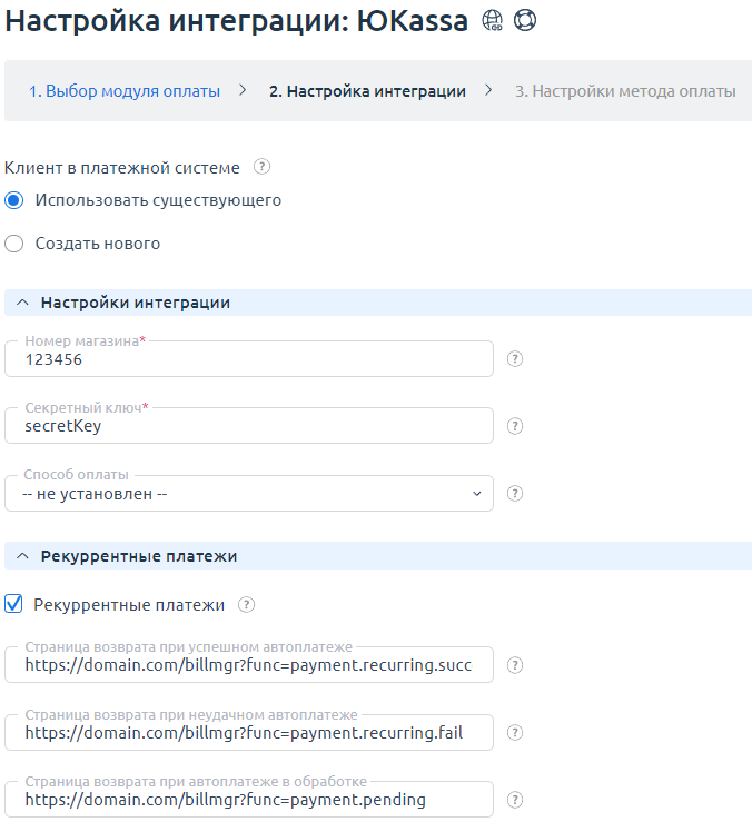 Страница возврата при успешном автоплатеже — ссылка для возврата из личного кабинета ЮKassa после успешной настройки автоплатежа. Используйте страницу BILLmanager https://domain.com/billmgr?func=payment.recurring.success или произвольную;