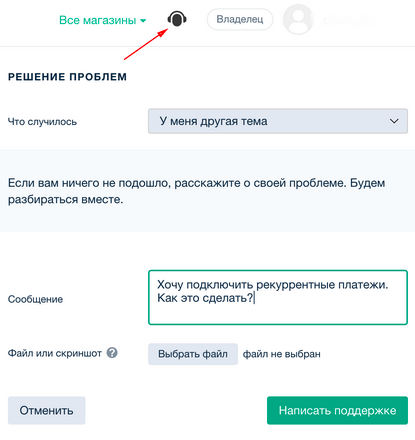 - В разделе Решение проблем напишите сообщение. Например: "Хочу подключить рекуррентные платежи. Как это сделать?"
