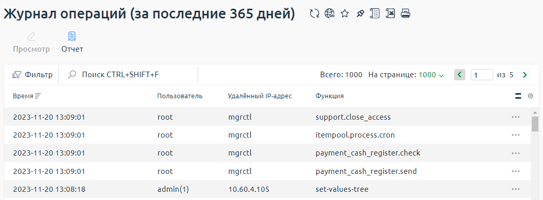 Если операция запущена платформой, то в поле Пользователь будет указан "root", а в поле Удалённый IP-адрес будет записано имя службы, которая запустила операцию.