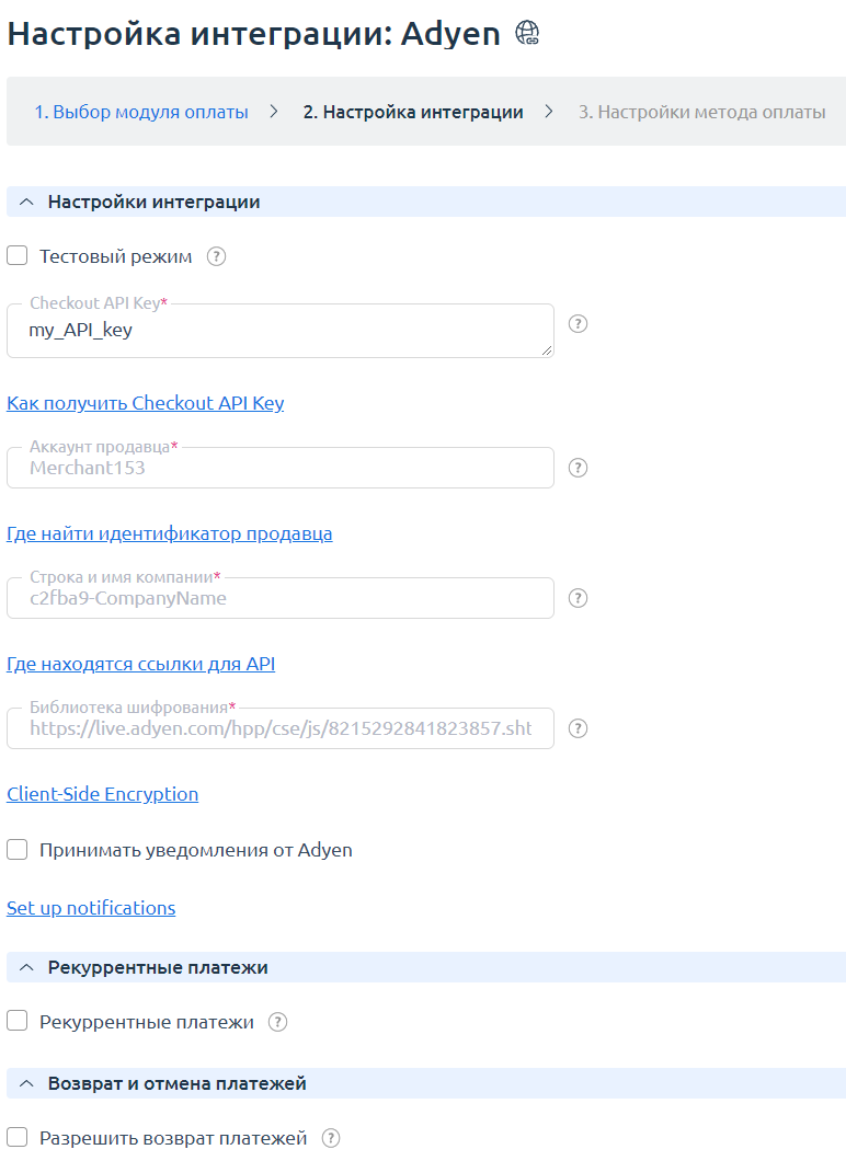 Для использования модуля оплаты Adyen необходимо выполнить настройки на стороне платёжной системы и подключить модуль в Clouden.