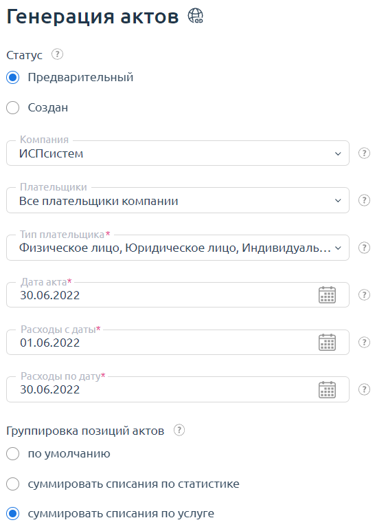 - Тип плательщика — типы плательщиков, для которых будет сгенерированы акты выполненных работ;