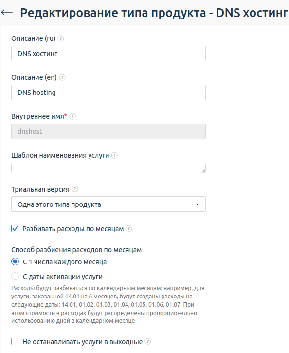 Когда клиент заказывает услугу на несколько месяцев, он оплачивает сразу весь период, соответственно, в системе создается один расход. Это может быть неудобно провайдеру с точки зрения ведения бухгалтерии — требуется не один акт за весь период действия услуги, а несколько помесячных актов. Для таких ситуаций в Clouden есть опция Разбивать расходы по месяцам. Она активируется отдельно для каждого типа продуктов: Продукты → Типы продуктов → Изменить → опция Разбивать расходы по месяцам.