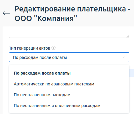 Также провайдер имеет возможность указать отдельный тип генерации актов для каждого плательщика: Клиенты → Плательщики → Изменить → поле Тип генерации актов. Типы генерации актов будут соответствовать глобальным, но индивидуальные настройки клиента имеют более высокий приоритет. Это позволит выбрать тип генерации для конкретных плательщиков.