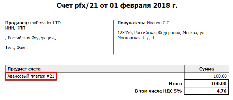 Например, провайдер использует следующий шаблон: "Авансовый платеж №{payment.number}". Тогда на форме счета под номером 122, в поле Предмет счета будет расположен текст "Авансовый платеж №122".