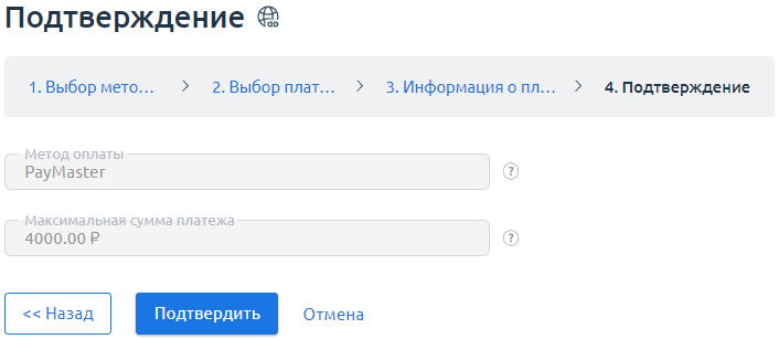 Нажатие Подтвердить перенаправляет клиента в платёжную систему, чтобы разрешить выполнение автоматических платежей на имя компании провайдера.