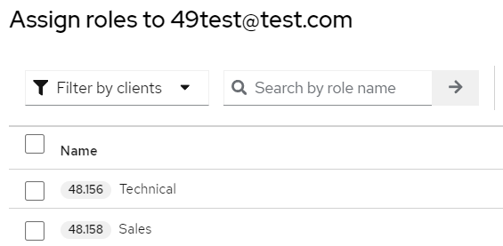- Назначьте роли пользователю интеграции (client) в системе Keycloak: перейдите на вкладку Service accounts roles → кнопка Assign role → установите Filter by clients. Выберите: