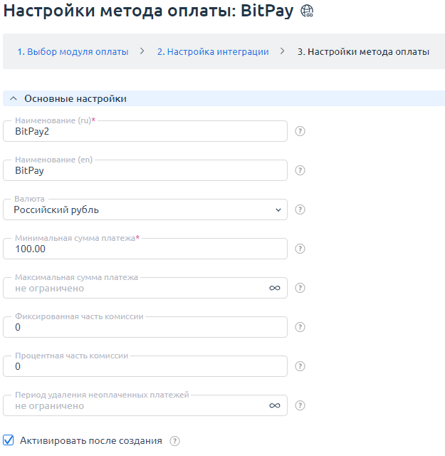 3. Настройки метода оплаты. Настройте внутренние (в пределах Clouden) параметры метода оплаты. Подробнее см. шаг 3 в статье Настройка методов оплаты.