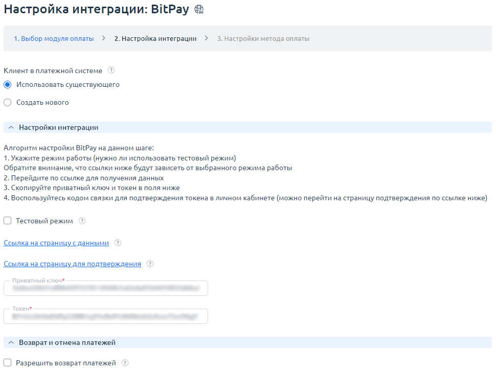 3. Вставьте полученные Приватный ключ и Токен в поля ниже.