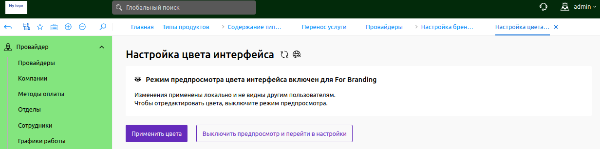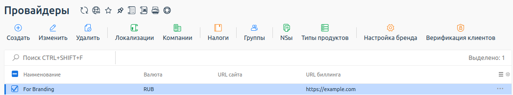 Чтобы брендировать интерфейс, в главном меню перейдите в раздел Провайдер → Провайдеры → выберите провайдера → кнопка Настройка бренда.