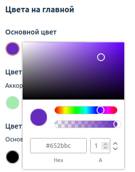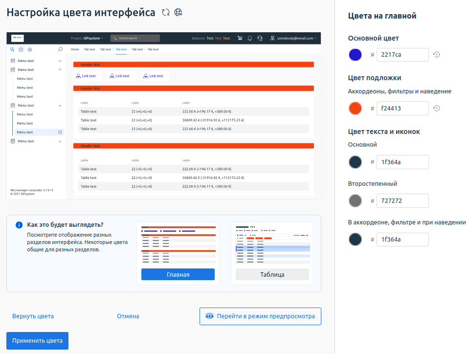 Все изменения отображаются во время предпросмотра интерфейса. Некоторые цвета будут общими для разных разделов. Например, Основной цвет определит вид активных кнопок и полей интерфейса.