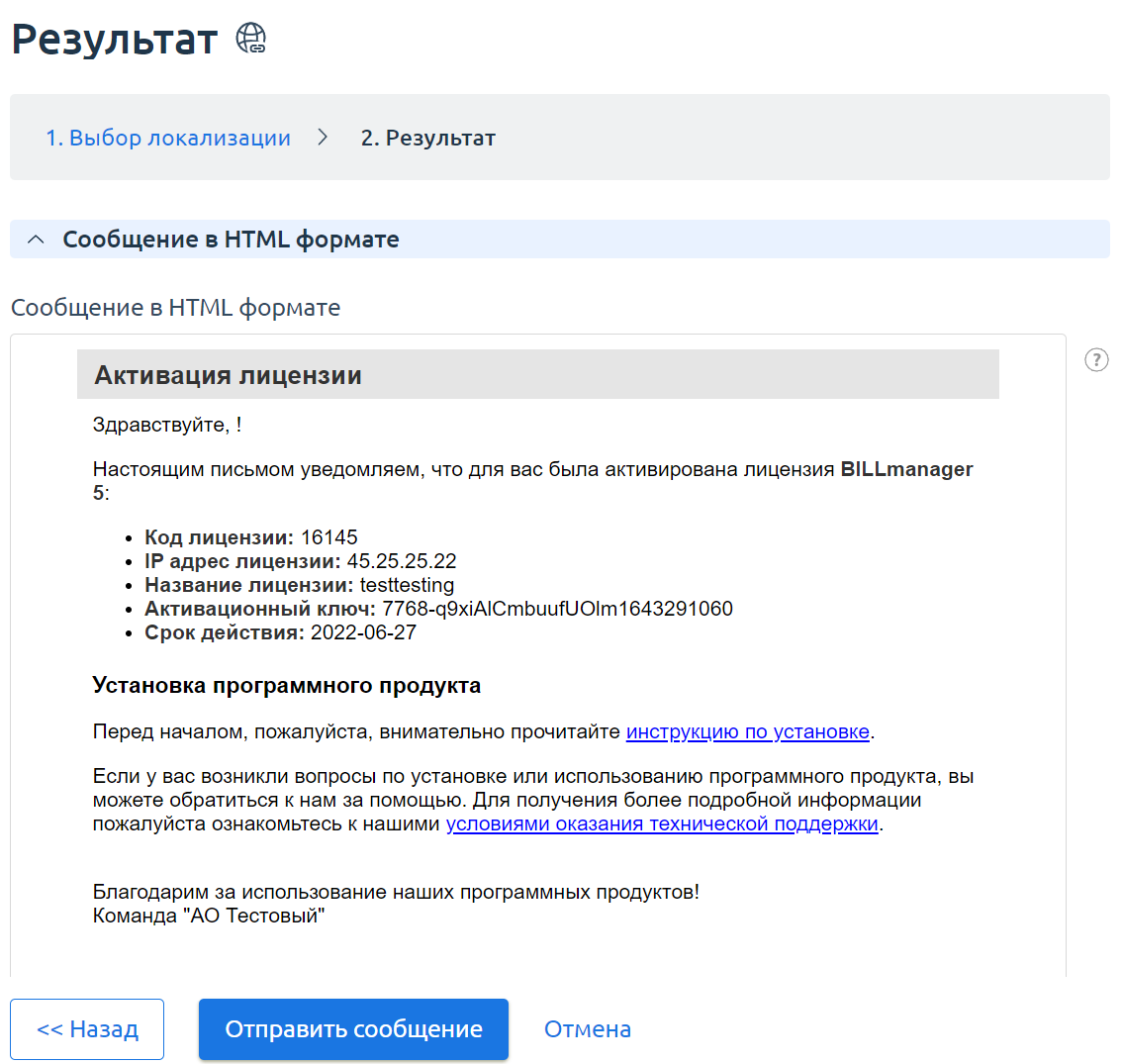 На форме испытания шаблона можно ознакомиться с содержимым исходного XML файла — вкладка "Исходный документ", содержимым полученного HTML-файла — вкладка "Сгенерированное сообщение", а также с формой представления информации клиенту — вкладка "Сообщение в HTML формате":