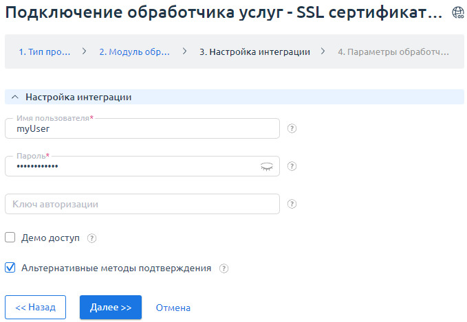 Интеграция настраивается в процессе создания обработчика услуг в Clouden.