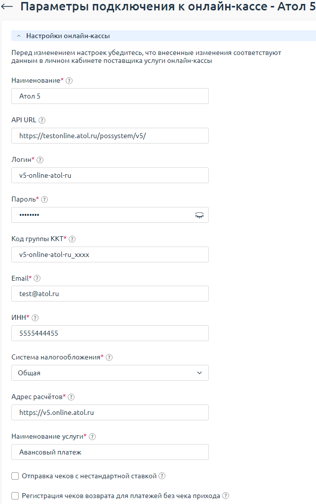 - https://testonline.atol.ru/possystem/v5/ — для интеграции с АТОЛ Онлайн API v5;