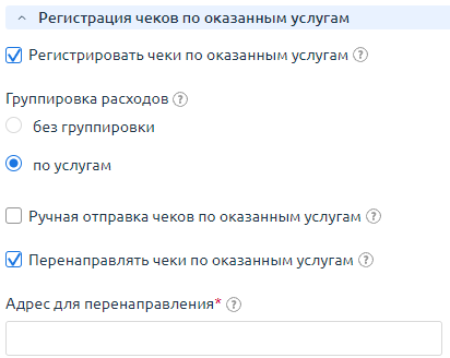 - Перенаправлять чеки по оказанным услугам — активируйте опцию, чтобы чеки по оказанным услугам отправлялись на указанную электронную почту.