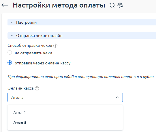 - Измените для методов оплаты кассу АТОЛ Онлайн v4 на АТОЛ Онлайн v5.