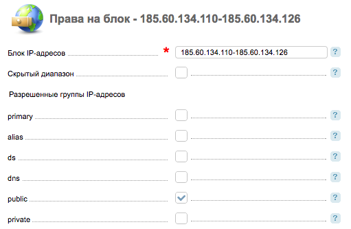 В списке Разрешенные группы IP-адресов необходимо отметить значение public. IP-адреса только этой группы используются биллинговой платформой для услуг "Выделенный сервер".