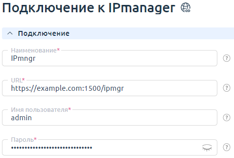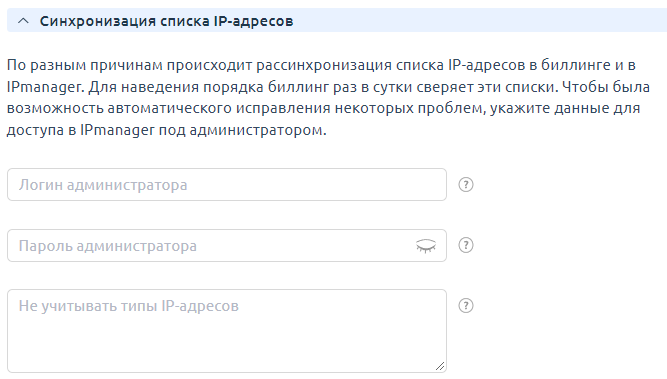Для синхронизации IP-адресов не рекомендуется указывать данные администратора IPmanager. Особенно, если в IPmanager существуют IP-адреса, занятые вручную (не Clouden'ом) и в биллинговой платформе эти адреса не привязаны к услугам.