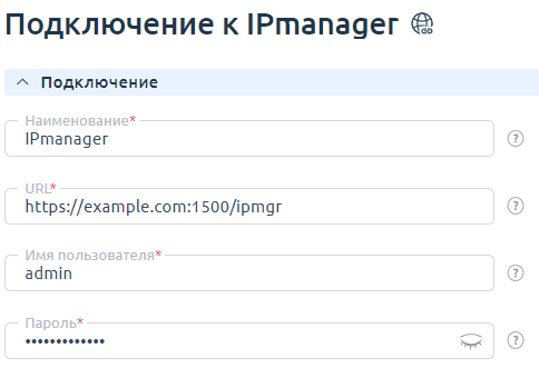 Для синхронизации IP-адресов не рекомендуется указывать данные администратора IPmanager. Особенно, если в IPmanager существуют IP-адреса, занятые вручную (не Clouden'ом) и в биллинговой платформе эти адреса не привязаны к услугам.