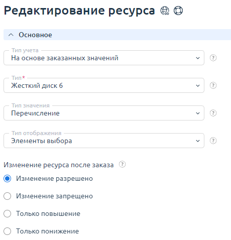 Ресурс "Дисковое пространство" можно изменять только в большую сторону. Рекомендуется в поле Изменение ресурса после заказа выбрать значение Только повышение.