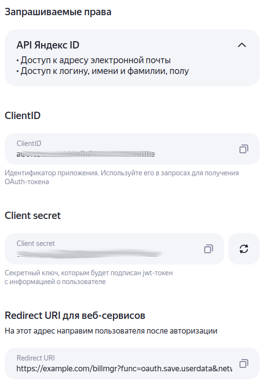 - Redirect URI : https://example.com/billmgr?func=oauth.save.userdata&network=yandex