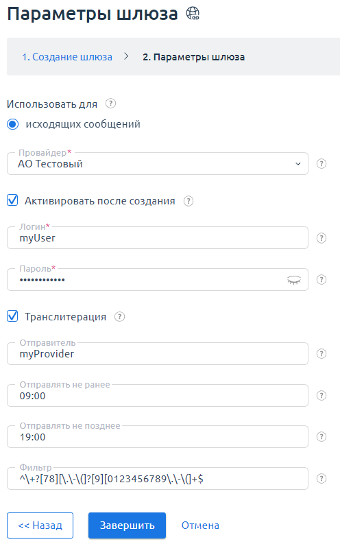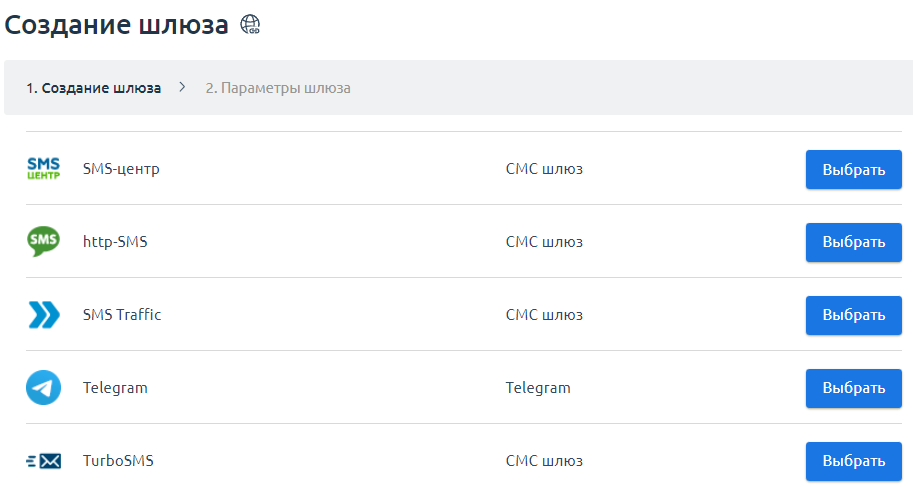 Пример 1. В Clouden настроено два шлюза для отправки уведомлений. В настройках первого шлюза для рассылки выбраны типы "Отправка счёта" и "Сообщение от провайдера". В настройках второго шлюза в поле "Типы уведомлений" ничего не выбрано. Через второй шлюз будут проходить все типы уведомлений, кроме тех, которые указаны в настройках первого шлюза.