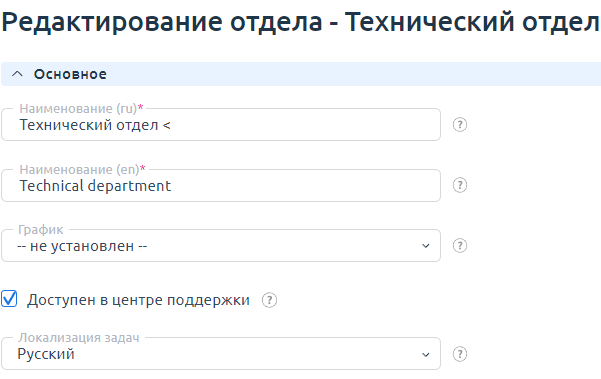 Провайдеру необходимо определить, какие отделы из структуры компании будут оказывать поддержку клиентам. Чтобы отдел был доступен в центре поддержки, необходимо на форме его редактирования отметить флаг Доступен в центре поддержки: