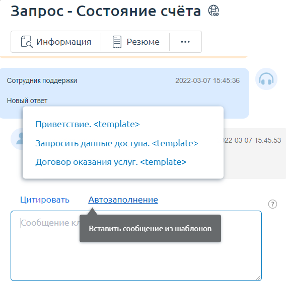 Созданные шаблоны ответов будут доступны сотрудникам для быстрой вставки в окне тикета: