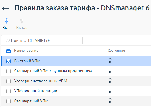 Нажмите кнопку Вкл. В столбце Состояние будет отображаться . Это означает, что зависимость от данного тарифного плана включена.