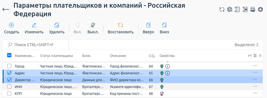 На формах работы с данными компаний или плательщиков отображаются параметры, которые имеют статус "Активен"