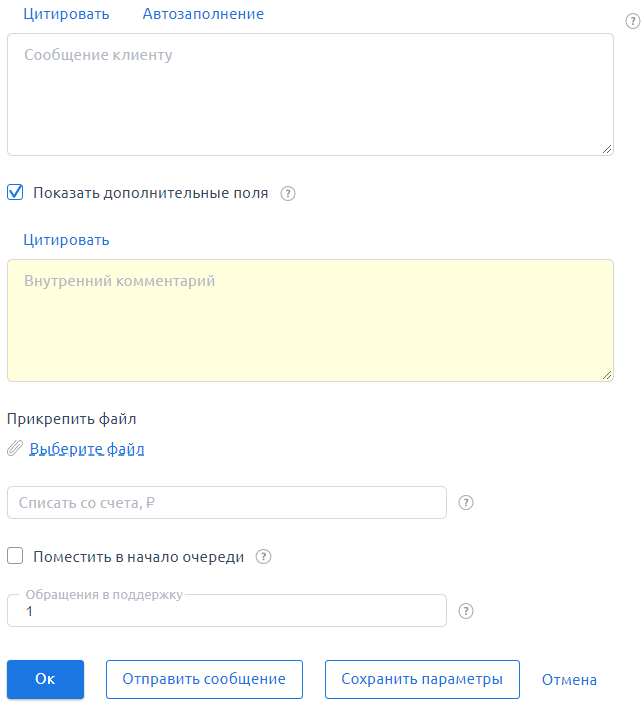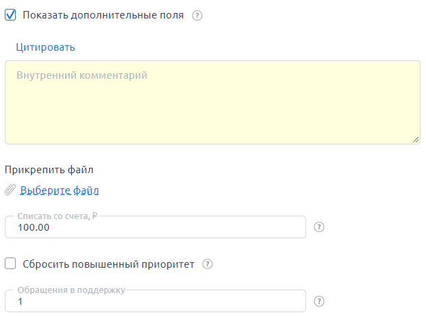 Чтобы списать средства сразу из тикета, включите опцию Показать дополнительные поля → Списать со счета → укажите сумму списания в валюте провайдера.
