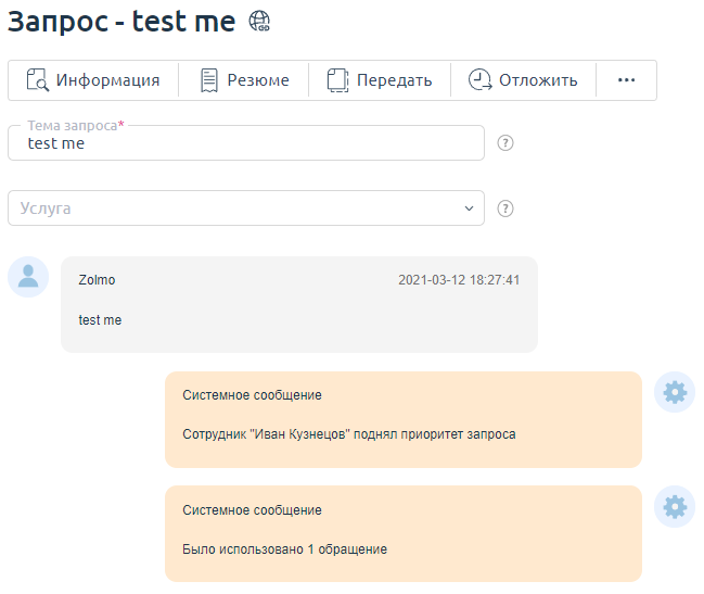 Сотрудники имеют возможность регулировать количество обращений, затраченных на решение тикета с помощью поля :