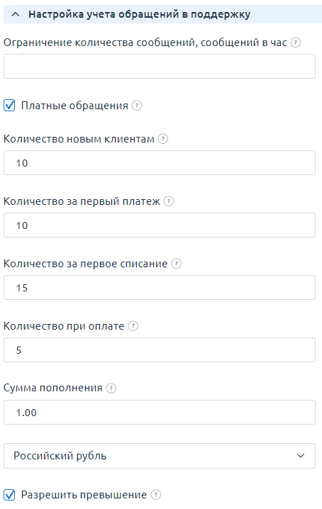 - Включите в блоке Настройка учёта обращений в поддержку опцию Платные обращения: