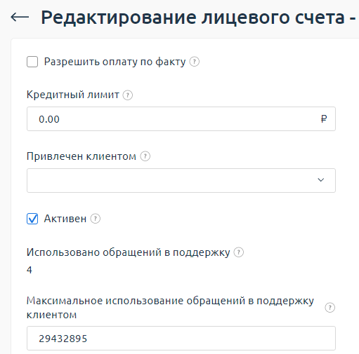 - Максимальное использование обращений в поддержку клиентом — лимит использования обращений в поддержку клиентом за все время.