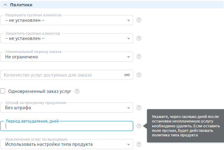 Поле Период автоудаления определяет количество дней, которое пройдет прежде, чем непродлённая услуга будет удалена автоматически. Оставьте поле пустым, чтобы просроченные услуги не удалялись.