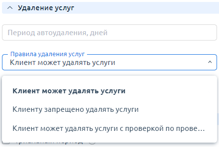 - Правила удаления услуг — политика доступа клиентов к удалению услуг: