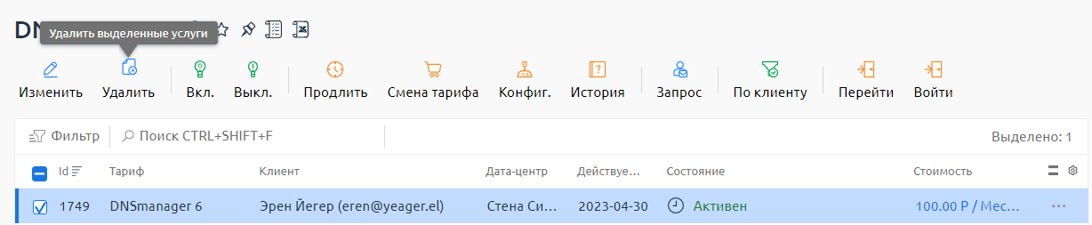 Администратор Clouden может удалить любую услугу каждого клиента.